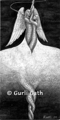Då fanns ännu inte rymden, utan en konvex yta som var täckt med hundratusentals fjäll. Denna yta sträckte sig längre än ögat kunde se. Om man följde fjällen neråt upptäckte man att de förenade sig med andra fjäll, i samma färg, och de två delarna flätade sig in i varandra i en ständigt stramare fläta. Ögat förlorade fokus och kunde inte längre skilja på de två ormskinnen som slingrade sig in i varandra. Om man tittade uppåt, mot de två sammanslingrade ormarnas huvuden, såg man att den första ormens kropp höjde sig längre upp och fjällen var inte längre fjäll, utan bildade en gudoms anlete; detta var det första ansikte som vittnade om vad en gudom är och på vardera sidan syntes andra huvuden, ett lejons och en oxes, och från ryggen reste sig ett par väldiga och fint tecknade vingar. En vit kvinnoarm borrade sig in och runt gudens arm högt uppe, liksom ormarnas stjärtar knöts ihop längst nere. Mot gudens anlete vände sig kvinnoansiktet och hon sträckte sin fria hand, bakom vilken den väldiga vingen vibrerade, ut så långt hon kunde: dit hennes fingernaglar nådde, där var Alltings gräns. De var ett orörligt och kungligt par: de hette Tiden-utan-Ålder och Ananke.”