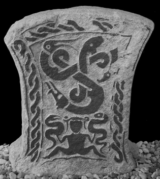 Triskelen utgör motiv på halva stenen. Många forskare har tolkat figurerna som olika djur som var kopplade till religiösa yttringar under keltisk tid. För mig framstår djuren i triskelen helt enkelt som ormar. Ormen intar en betydelsefull roll i en lång rad religioner världen över. Vi finner den på många hällristningar. Den behornade ormen eller ormen med vädurshuvud var kanske det mest typiska kultdjuret hos kelterna. Den förknippas med i huvudsak tre gudar, den gud som de antika författarna kallar Mercurius, även av en forskare Ross kallad den trehövdade guden, vidare den keltiska motsvarigheten till Mars och slutligen Cernunnos. Den franske forskaren Paul-Marie Duval har tolkat ormen med vädurshuvud som en särskild gudomlighet. Ormen som symbol känner vi till såväl från Kreta som Egypten. Den egyptiska kobraormen var en symbol för gudinnan som skaparen. Den så kallade Uraeus, kobran, var det hieroglyfiska tecknet för gudinna. För grekerna i Egypten representerade ormen, nu kallad Buto, tillsammans med gamgudinnan Nekhbet cykeln födelse och död, början och slutet. Kobragudinnan kopplas slutligen till Isis som solens moder. Isis förknippades med korgar med säd som vaktades av hennes heliga ormar, enligt en relief i ett av hennes romerska tempel från början av andra århundradet v.t. Den danske forskaren Flemming Kaul tolkar ormen på såväl hällristningar som bronsföremål som en hjälpare till solen i dess gång över himlen på dagen och genom undervärlden på natten. Kaul menar att ormen ska ses som en representant för de positiva krafterna i kosmos. Andra har påpekat att ormen är en symbol för kreativitet och regelbundna förnyelser genom dess förmåga att byta skinn. Den kan också uppfattas som en symbol för underjorden och dödsriket, förmodligen genom sitt liv i hålor och i det dolda. Ormen kan representera både en välvillig, klok varelse liksom en dödsbringande. Även från Litauen möter vi exempel på synen på ormen som en god kraft. Marija Gimbutas berättar att hennes mor i början av 1900-talet observerat, att man hyste den största respekt för ormar. De bodde under golven i husen, gavs mjölk och de tilläts till och med inne i folks hem. Att skada en grön orm ansågs som en svår synd. En orm i huset betydde lycka och välstånd, den försäkrade tillökning i familjen (den hölls under sängen hos nygifta par) och även bland djuren och garanterade bördighet för jorden. Än i denna dag dekorerar ormar hörn, fönster och tak på baltiska hus. Trehundra år tidigare, år 1604, rapporterade en förvånad jesuitmunk hur ormen dyrkades i Litauen. ”Folket har nått en sådan grad av galenskap att de tror att gudomligheter existerar i reptiler. Därför bevakar de dem noga så att inte någon skada ska hända ormarna som hålls i husen. Vidskepligt tror de att olycka ska komma på dem själva om någon inte visar respekt mot ormarna”. Man kan i detta sammanhang erinra om närheten mellan Litauen och sydöstra Gotland.