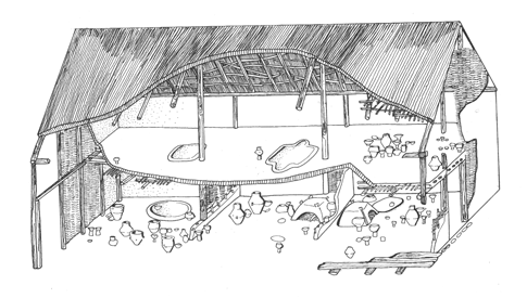 Fig 3 En rekonstruktion av ett tvåvåningshus med ugnar. Tisza-kulturen; 4800-4700 f Kr, Herpály, östra Ungern.