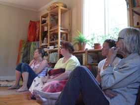 Workshopens tema var balansen mellan det manliga och det kvinnliga inom oss. Efter en kort presentationsrunda så får vi alla dra ett eller flera djurkort som Shirley lagt ut i en cirkel mitt i rummet. Dessa djursymboler kan bli våra hjälpare, djurguider, eller på annat sätt belysa vår nuvarande situation. Jag drar ett kort och får en ko. Det finns en bok där man kan läsa om korten och i den står att kon är en livgivare och symboliserar moderskap och närheten till gudinnan.