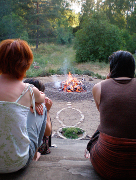 Ett annat plus gällande kursveckans arrangemang som jag från början hade betraktat som ett minus handlade om maten. Nau∂ hade tänkt anlita en lokal cateringfirma men de hade semester så vi fick dela upp oss och ansvara för maten en dag/par. Jag trodde att det skulle bli rörigt men alla la massor med känsla och kärlek i detta att bjuda och ta hand om alla andra, så det blev också en fin del av kursen. Därtill en kulinarisk resa – vi fick allt från paella till murrikastekt souvas. (För den som inte vet så är paella en spansk nationalrätt och souvas är renkött som är både rökt och rimmat. Det skärs i tunna skivor innan stekningen. Med en murrikahäll steker man över öppen eld.) Vegeterianerna ropade också matens lov, men i deras läckerheter blev jag inte så insatt, typiskt rovdjur som jag är… Apropå eld så var elden där vi värmde stenarna till svetthyddan bland de vackraste eldar jag sett – och då var jag inte ens sä rskilt positivt inställd från början – eller sugen på vare sig eld eller svetthydda eftersom vi hade haft över 30 grader varmt hela dagen.