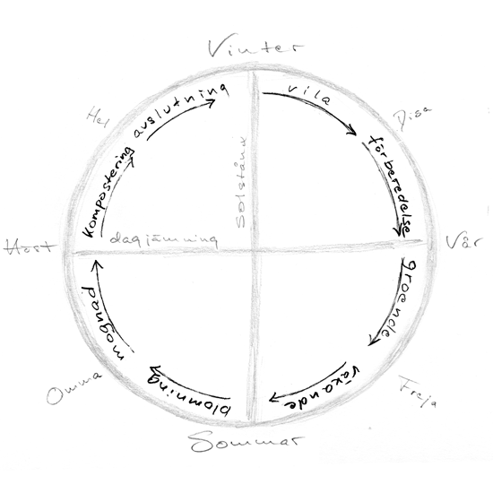 Solhjulet är årstidernas växlingar skapade av solens rörelse och eftersom det är ett hjul, en cirkel kan man börja var som helst på hjulet. Jag väljer att börja vid Helhelgen, dödens helg, eftersom död är förutsättning för liv, vilket naturligtvis innebär att liv är förutsättning för död men någonstans måste vi börja. Min upplevelse är att vi finner livet intressant och döden outgrundlig och dessutom vet vi mer om livet än om döden så Hel är för mig början på det nya året.